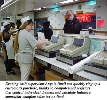 Cold beverages are kept in a retarder behind the counter, but customers who want coffee serve themselves at a coffee station after they've checked out. To keep things simple, the employees provide a 12-oz. foam cup and a lid to these customers at the cash register, which allows them to fix coffee to their liking without holding up service for other shoppers. Computerized registers set with price lookups automatically figure out if tax should be applied, and what percentage. The store employees each have their own drawer, making it a little easier to balance their cash at the end of their busy shifts.