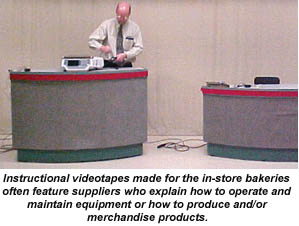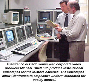 The videotapes are filmed at Marsh's headquarters, where a fully equipped studio allows the tapes to be edited and duplicated for all 70 of the Marsh stores. The bakery department sends out a videotape bimonthly. When there are no new products to be introduced, the topic intead might be a detailed explanation of flower-making for cake decorations, a close look at how to maintain a particular piece of equipment, or a demonstration on how to put together an effective product display. "We want the message to be consistent to all the stores," says Di Carlo, "and we've found that today's employees learn better when they see a visual presentation. Of course, we also follow up with written materials. For example, our cake manuals show a picture of a finished cake, explain how to assemble the cake, and show the potential profitability for each variety."